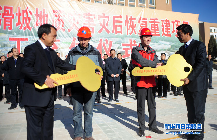12月1日,在甘肅省東鄉族自治縣縣城災後恢複重建建成項目交付儀式上,建設方代表向東鄉縣政府代表交付竣工項目“鑰匙”。