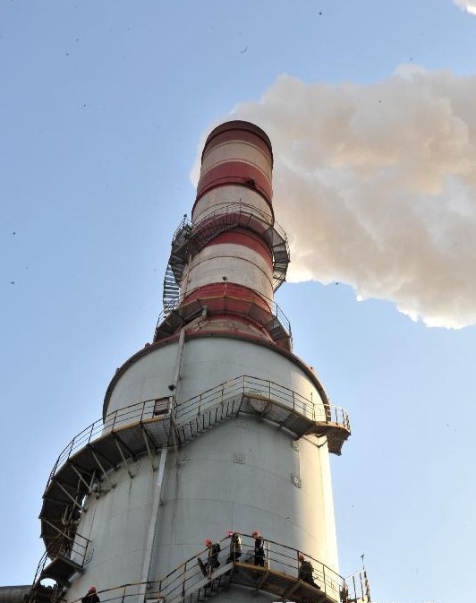 12月19日,天津市环保局工作人员准备攀登到烟囱顶部检测天津天钢联合特钢有限公司排放的气体。