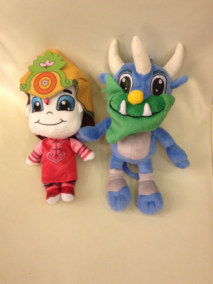 图为春节吉祥物“春娃”(左)与“年兽”(右)玩偶