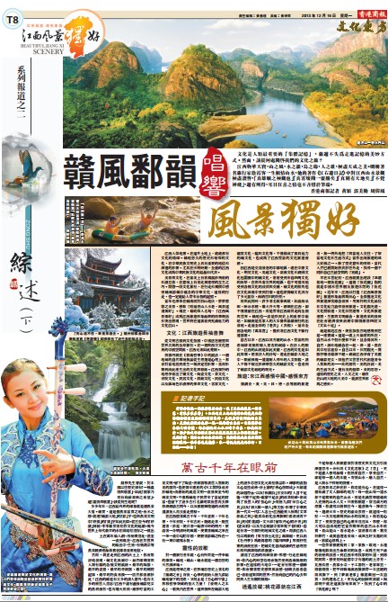 文化是人類最重要的「集體記憶」,旅游不失為走進記憶的美妙方式。然而,該從何處開啟我們的文化之旅?江西物華天寶,山之風,水之韻,鳥之緣,人之歌,極盡天成之美。明朝著名旅行家徐霞客一生傾情山水,他的著作《江右游日記》中對江西山水景觀極盡赞譽,「真雄曠之極觀也」「真霄壤間一靈勝矣」「真別有天地矣」「不覺神飛」,游有所得,耳目狂喜之情毫不吝惜於筆端。香港商報記者 黃穎 郭美勤 周偉鳳