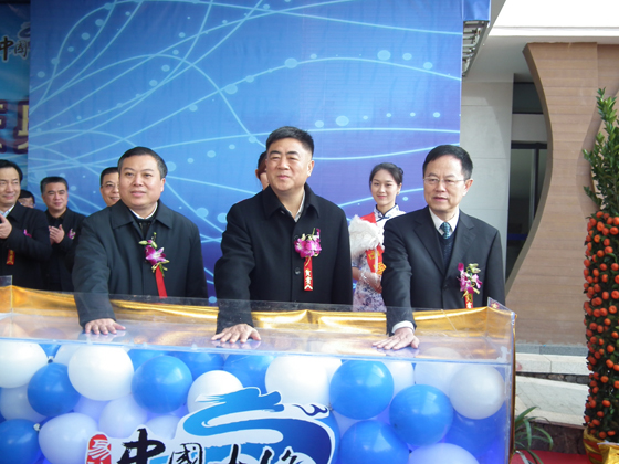 江西省副省長朱虹(中)、福建省政協副主席薛衛民(右)、宜春市委書記鄧保生一同按下手印為中國古海開業揭幕。