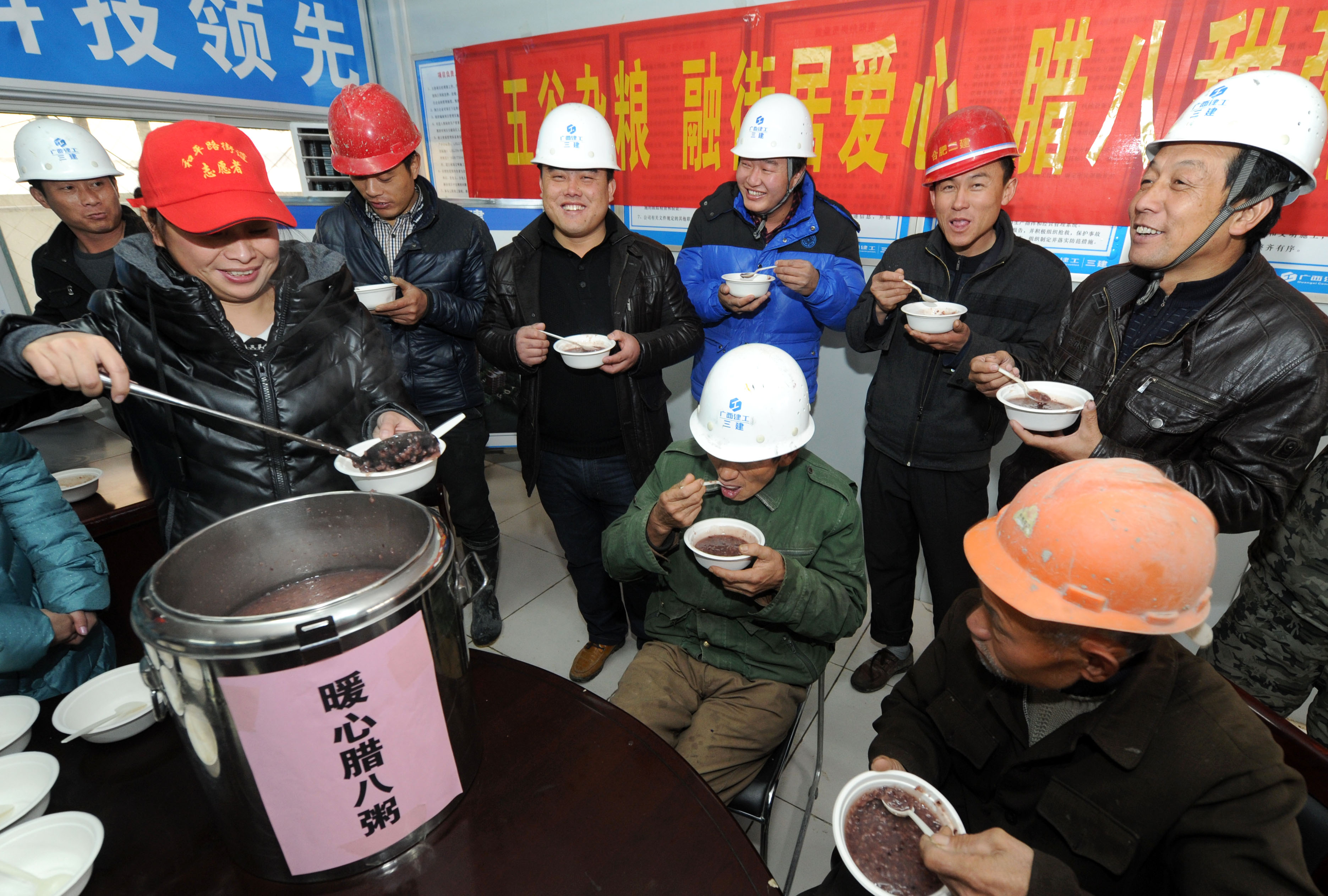 【香港商报讯】通讯员解琛报道:1月8日,在合肥市瑶海区和平路街道辖区“百货站棚户区”改造建设工地上,来自合肥市瑶海区和平路街道当涂路社区的志愿者们正在为棚户区改造建设工地上的农民工建设者们送上热腾腾的腊八粥,让他们感受到节日的温暖。