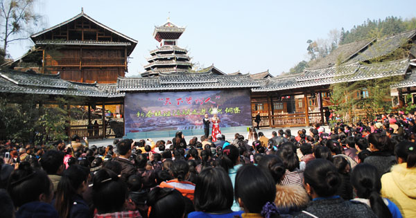 在肇兴侗寨萨玛天岁表演场,旅美华人歌唱家尤雁子,苗族著名歌唱家阿幼朵,苗族“影视歌”三栖明星王飞鸿等与当地的侗族姑娘、小伙一起倾情演艺。《善良的姑娘》、《男儿当自强》等精彩节目,为当地侗族群众呈现了一场现代歌舞与侗族原生态歌舞交汇的文化盛宴。图为活动现场。