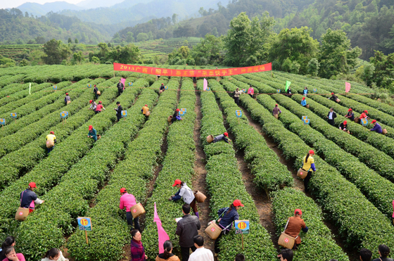 采茶姑娘在广西昭平县走马乡庙枒村龙湾无公害生态茶园采摘春茶.