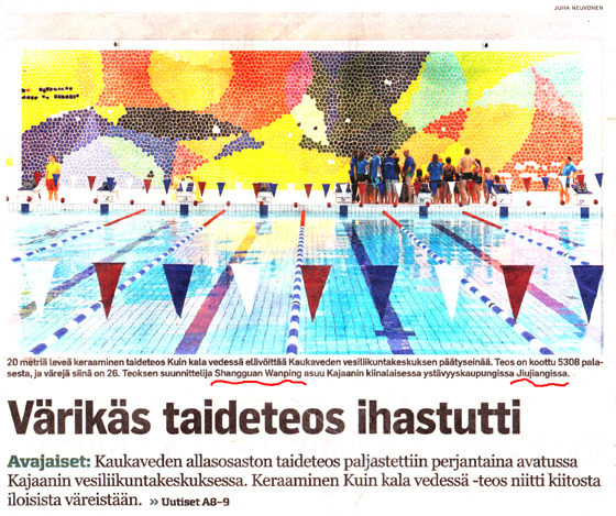 【香港商报讯】记者周伟凤 通讯员 江书福 报道:九江设计开始走出国门。近日,由九江学院艺术学院上官万平老师主创设计的卡亚尼市公共游泳馆《鱼、娱、寓、愉》艺术主题墙,在多名欧洲设计师的作品中突围,成功获选并正式在芬兰卡亚尼市的公共游泳馆落成。