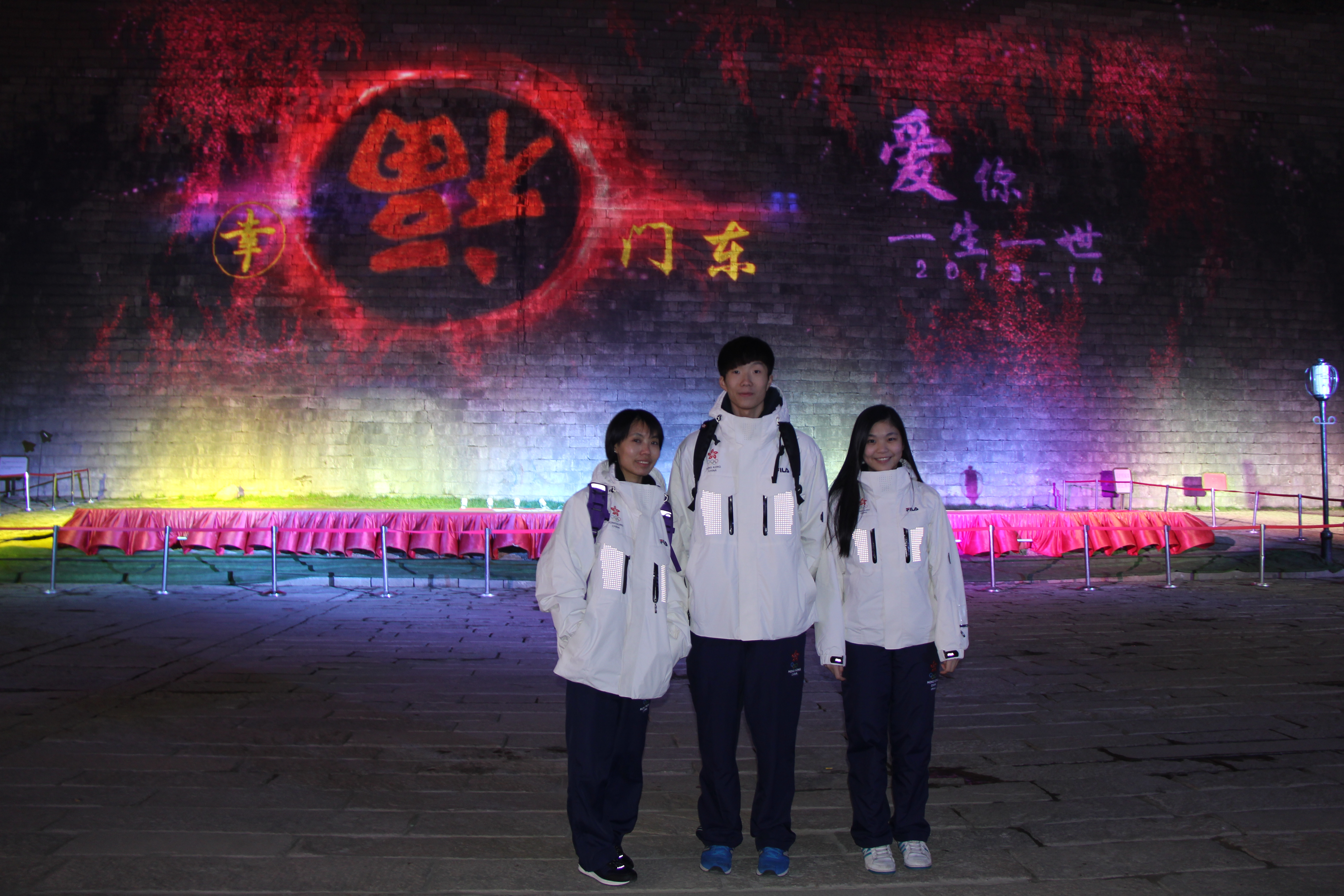 香港奥组委体育干事谭洁媚与香港击剑运动员张家朗、何迪琳在南京老门东明城墙前合影(香港商报记者 姚霄 摄)