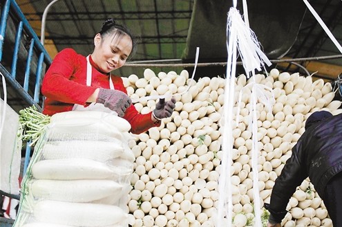 2月10日,盘溪蔬菜批发市场,一名菜贩正把货车上的白萝卜装袋。春节假期结束后,我市蔬菜价格稳中有降,白菜、青椒等蔬菜降幅在10-20%。