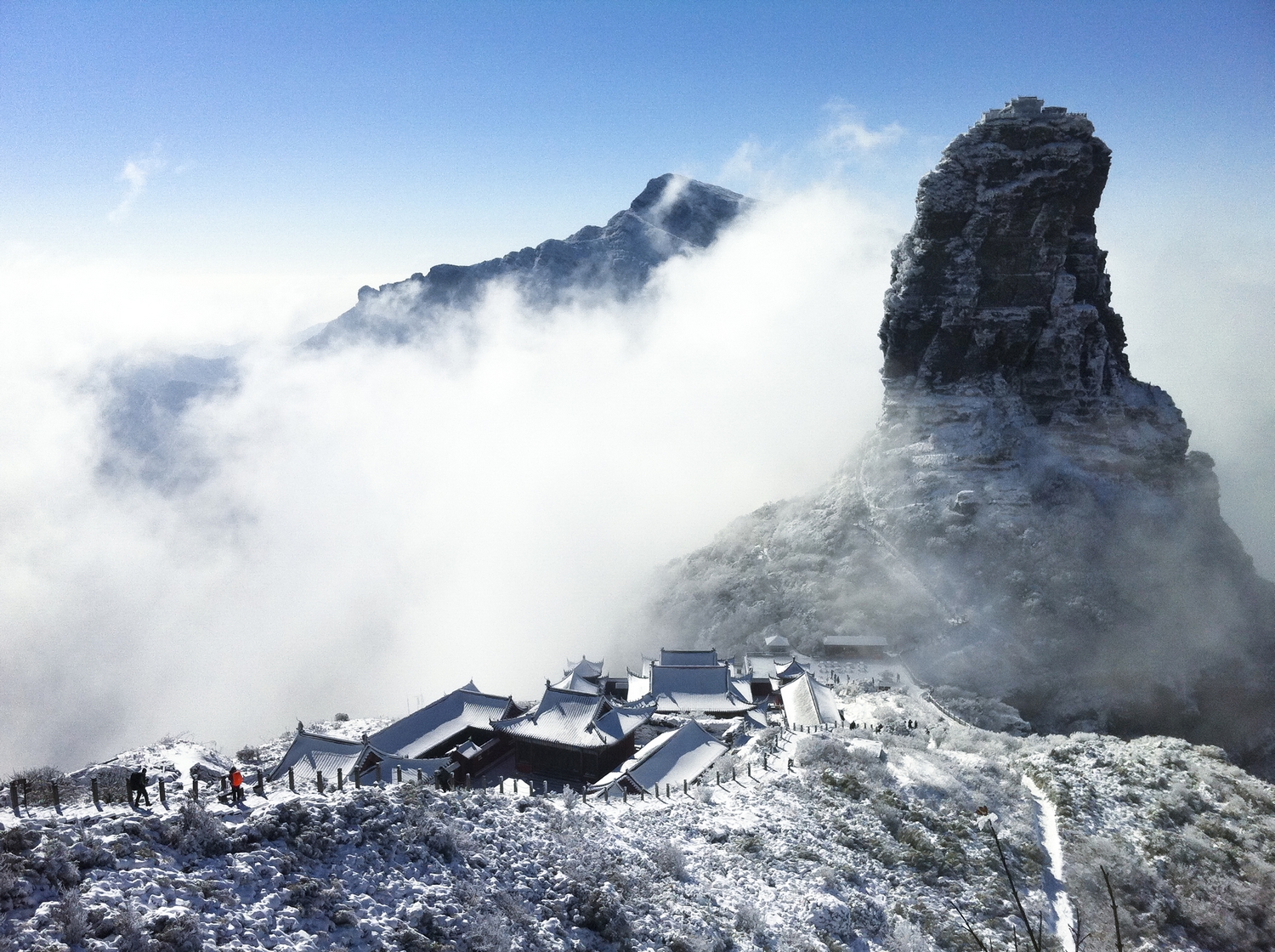 看這遺世獨立、直插雲霄的梵淨金頂,絲毫不改他往日的堅毅與灑脫,在這萬般俱靜的環境中,在藍天白雪的映襯下,更顯孤傲與挺拔。還有那高聳入雲的彌勒佛殿和釋迦殿,在金頂之巔瞰視環宇,接受世人朝拜。