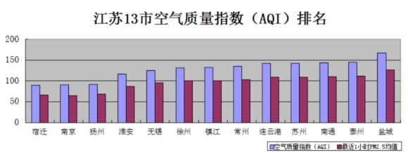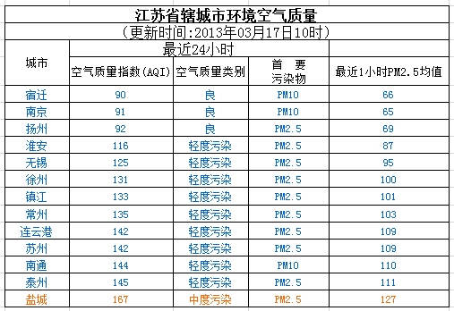 人民网南京3月17日电 (胡伟)根据江苏省环保厅数据,截至3月17日10时,盐城成江苏唯一空气质量为中度污染的城市,宿迁、南京、扬州3市空气质量为良,其余9市为轻度污染。