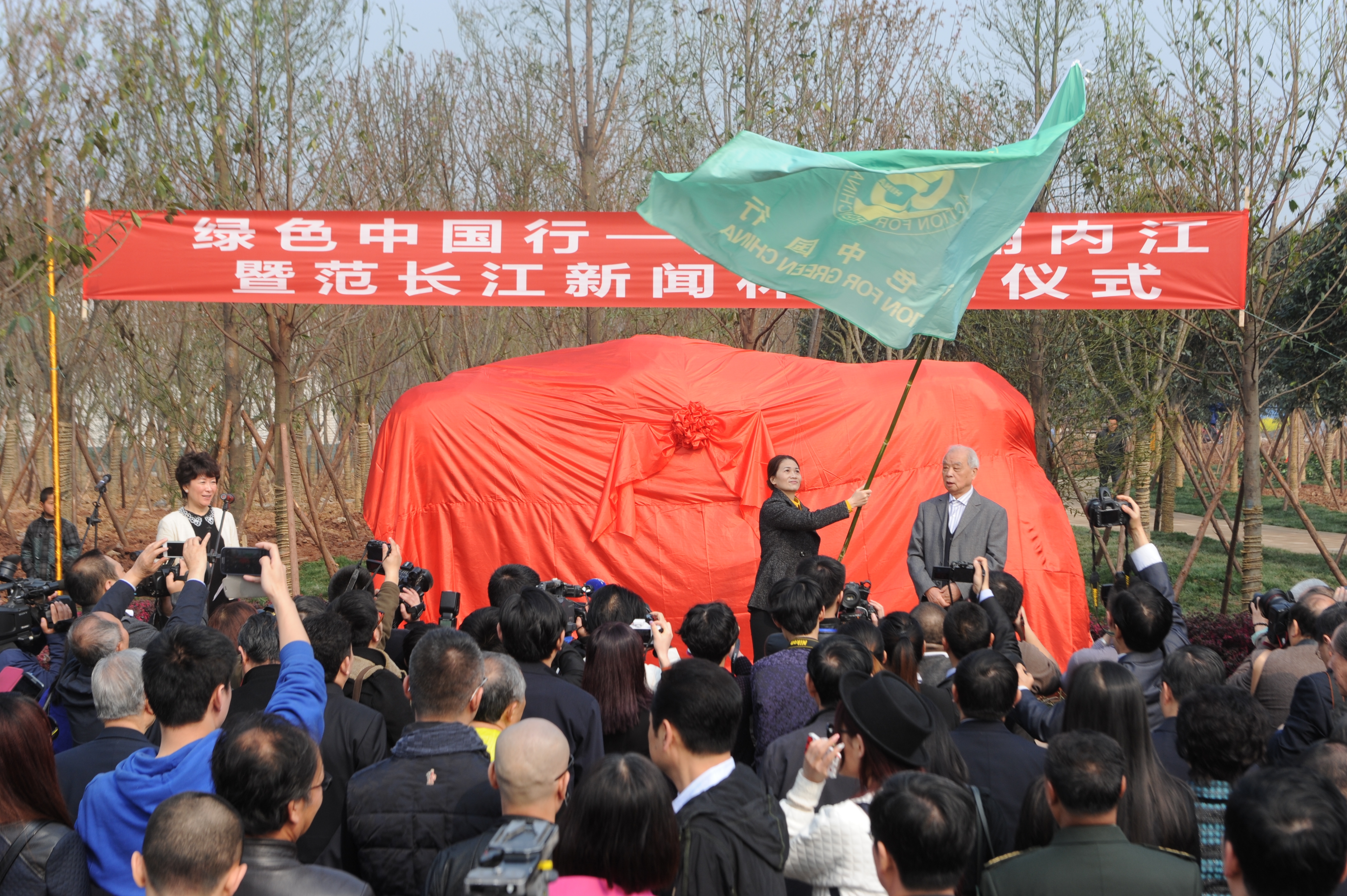 启动仪式上,中华全国新闻工作者协会名誉主席、人民日报社原社长、绿色中国行活动组委会顾问邵华泽为内江市东兴区授“绿色中国行”旗帜,内江市东兴区人民政府区长徐炼英接旗.