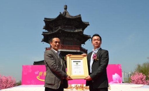 上海大世界基尼斯总部工作人员(右)向桃园景区颁发证书