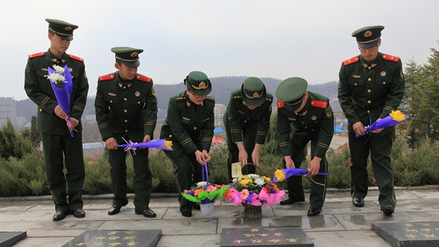 4月2日,辽宁边防总队丹东港边检站7名官兵来到丹东市振兴区抗美援朝烈士陵园,举行祭奠山东威海籍志愿军王吉岩、王培义等六名烈士的爱国主义教育活动。
