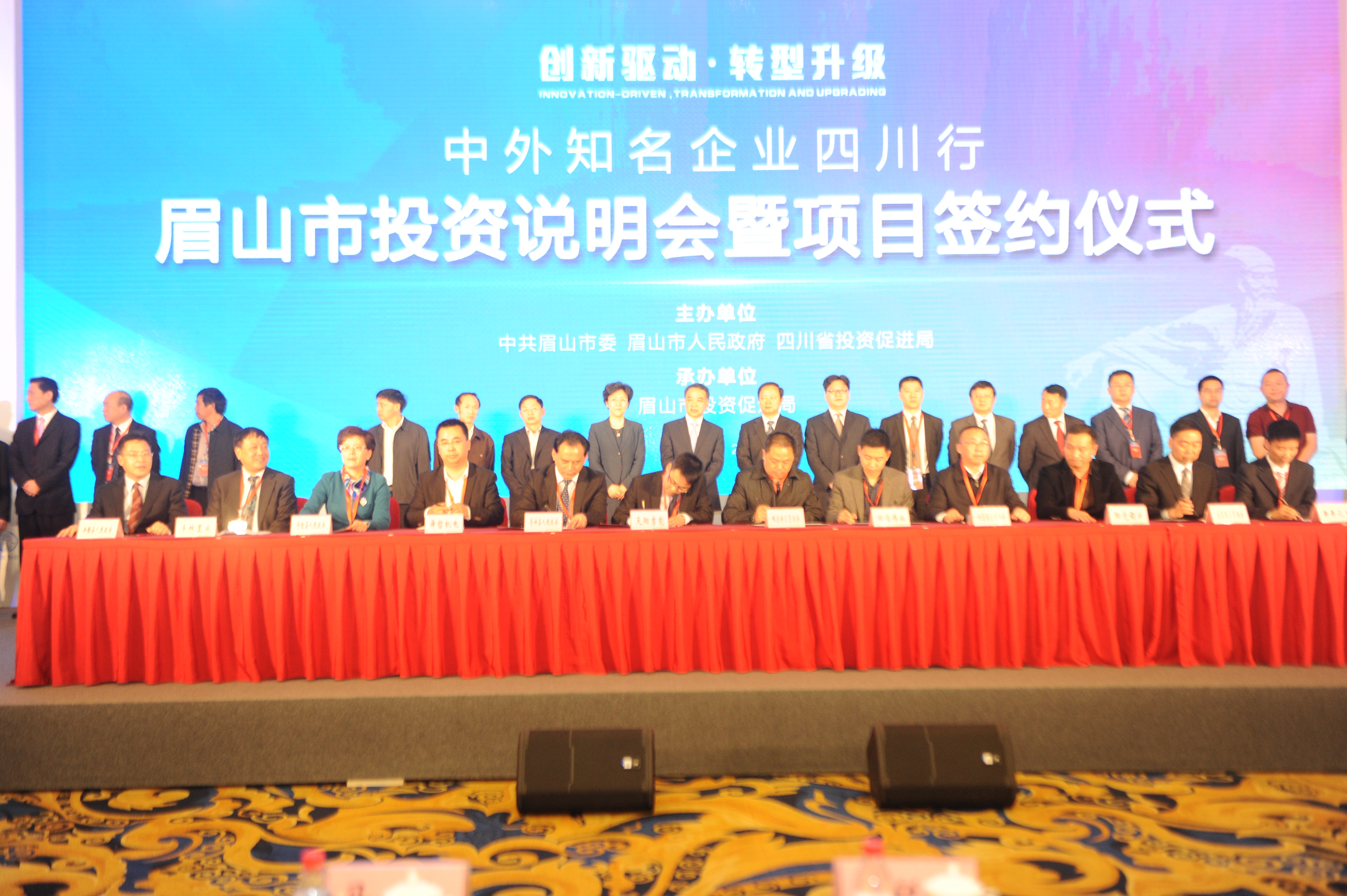以“创新驱动·转型升级”为主题的中外知名企业四川行眉山市投资说明会暨项目签约仪式现场