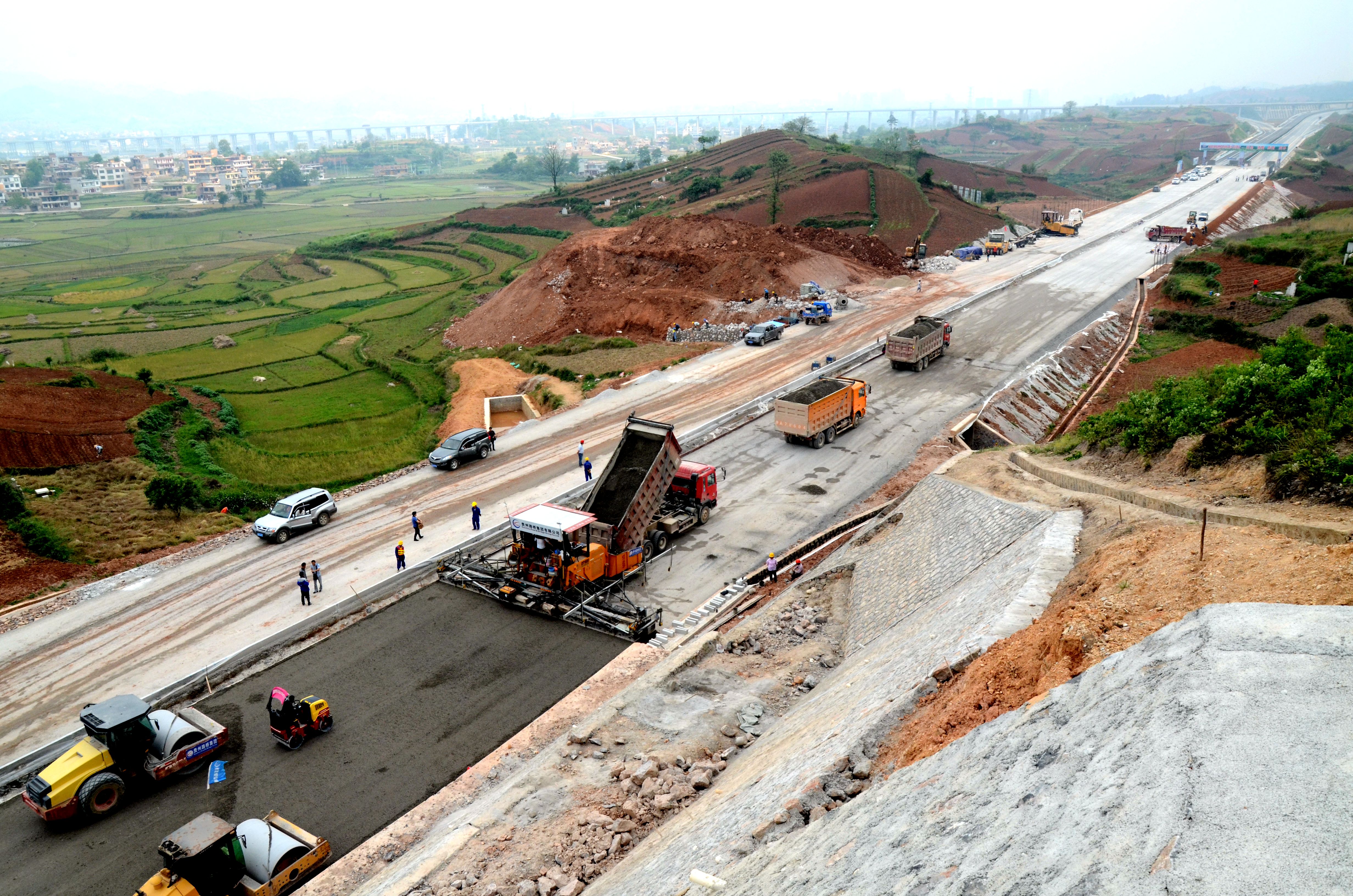 4月17日,记者在惠水至罗甸高速公路平直宽广的路面上,看到一辆辆压路机在路面上来回滚动,工人熟练的牵着混泥土养水膜为路面做“保鲜”处理,很难相信这一段接近完工的高速路是去年的4月15日才开工建设的。