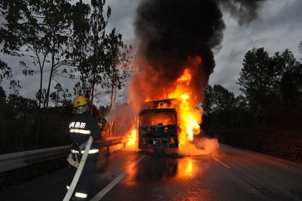据自燃货车的驾驶员介绍,他驾驶车辆行驶至该路段时,发现副驾驶位置窜出火苗,但由于车上未配备灭火器,未能第一时间扑救,火势迅速蔓延至车厢,点燃轮胎及装载的汽车零配件。