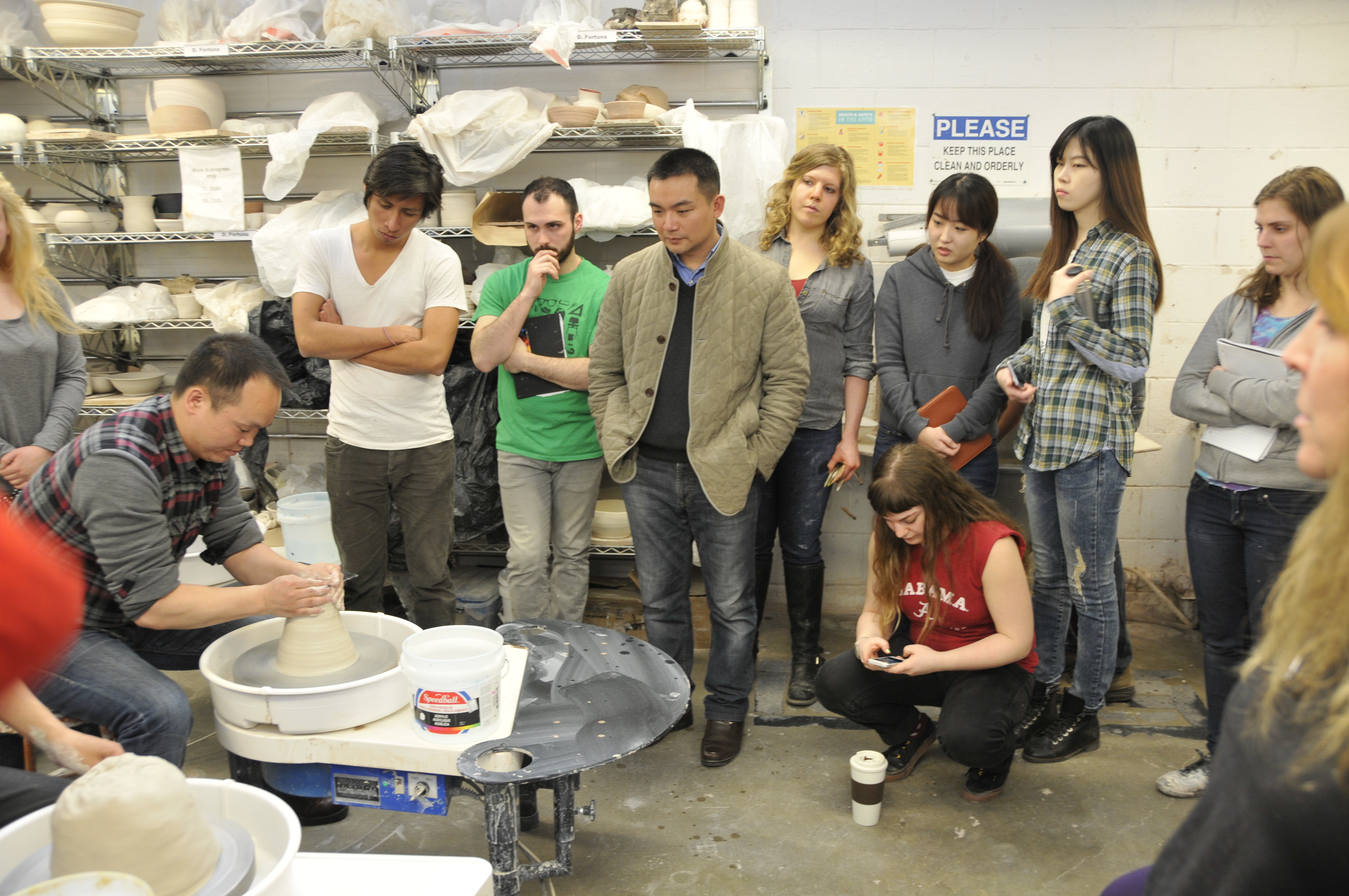 翁彦俊先生(前排中站立者)向芝加哥艺术学院的学生讲解景德镇传统拉坯工艺.