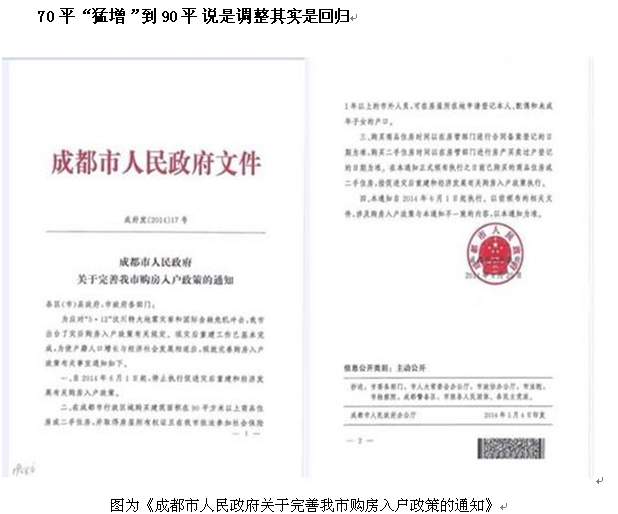这则《成都市人民政府关于完善我市购房入户政策的通知》,主要内容是停止执行灾后重建关于购房入户的政策,将原规定的“购买70平米以上商品住房(含二手房)的市外人员可申请入户“,更改成“购买建筑面积在90平米以上商品住房或二手住房,并取得房屋所有权证且在我市依法参加社会保险1年以上的市外人员”可入户。通知要求2014年6月1日起执行。