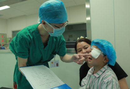 男护士陈璜在手术前核对患者信息,耐心的询问小患者病情,并与其逗趣,体现了温情细心的一面。