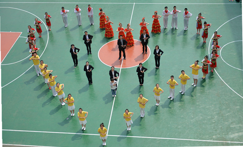 捐赠活动中,太原市聋人学校学生与生命人寿山西分公司工作人员构筑“心”型图案 何光晖摄