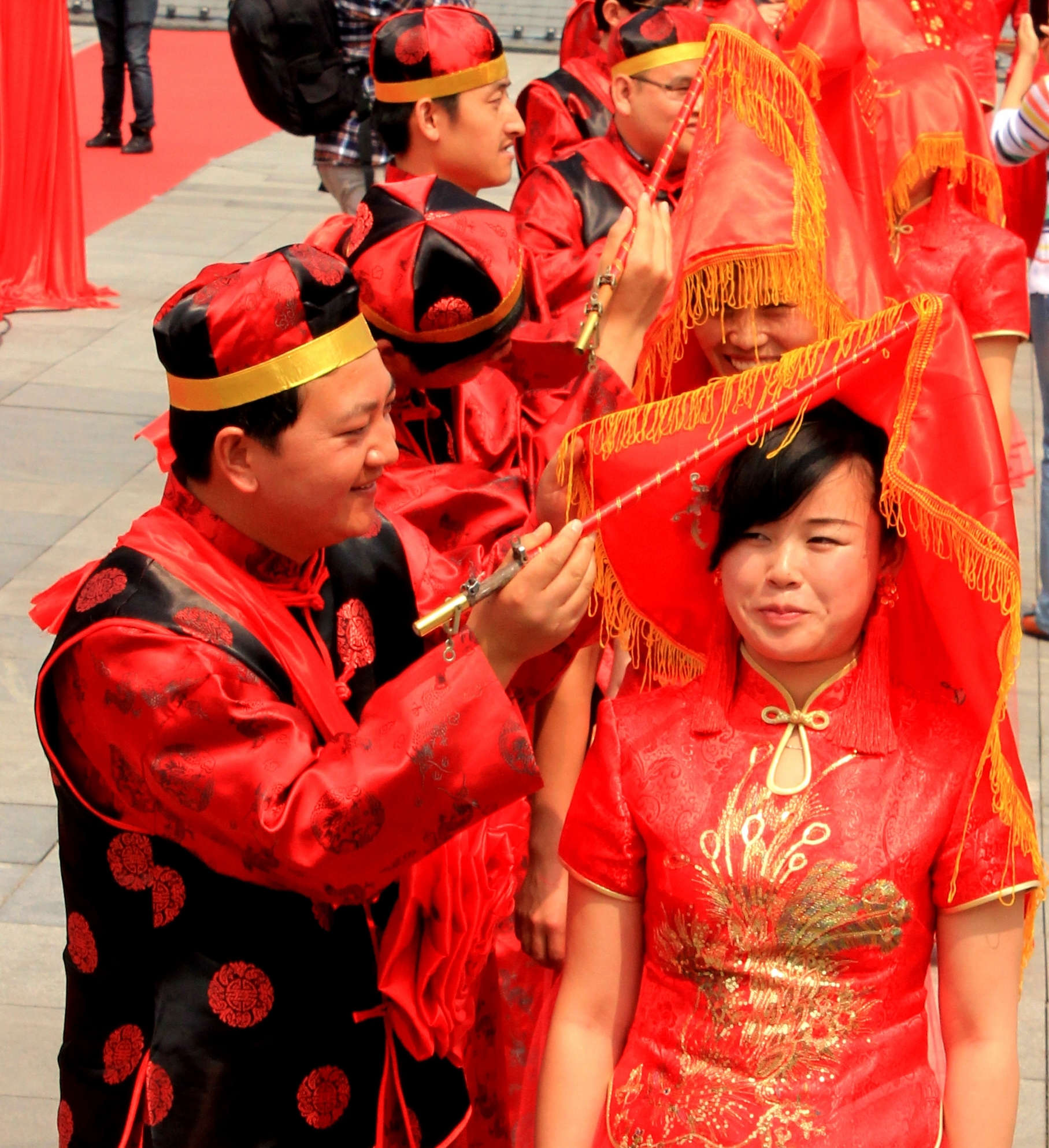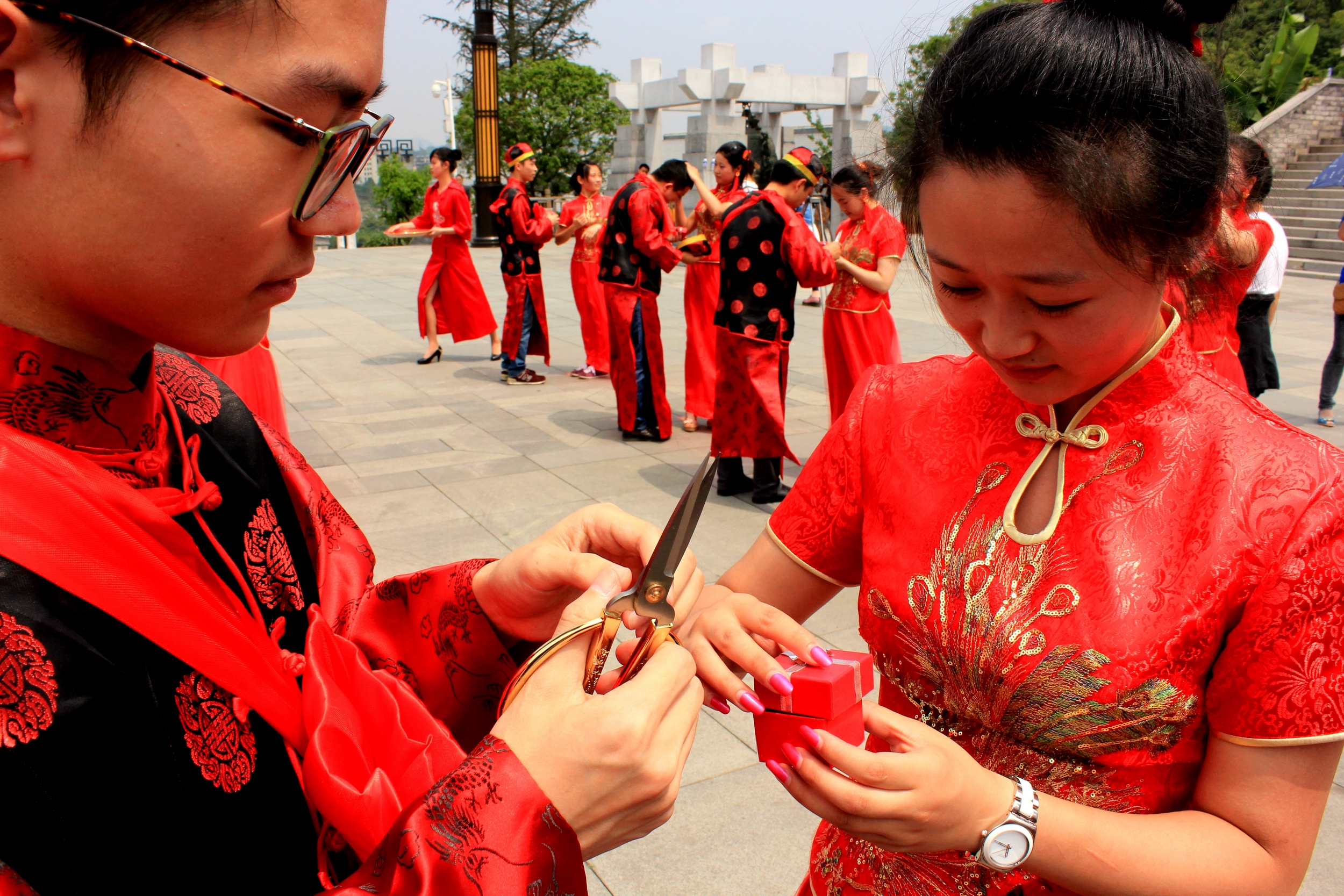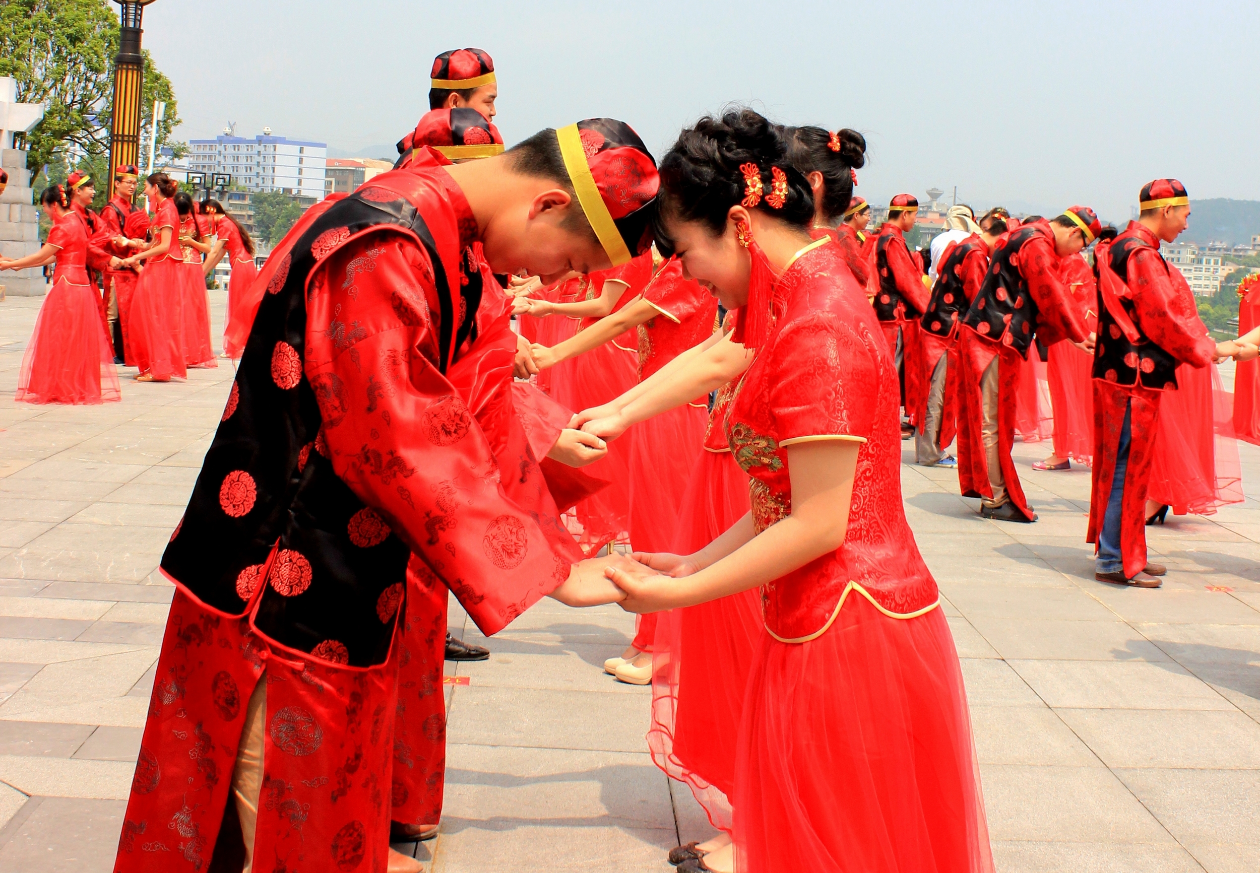 活动当天,伴随着悠悠汉唐音乐,新人们身着高贵、典雅、端庄的汉唐服装,在集体婚礼上行“执手礼、合卺礼、解缨结发礼”等传统礼数,秉承“结发为夫妻,恩爱两不疑”、“执子之手、与子偕老”等千古佳言,庄严许诺。