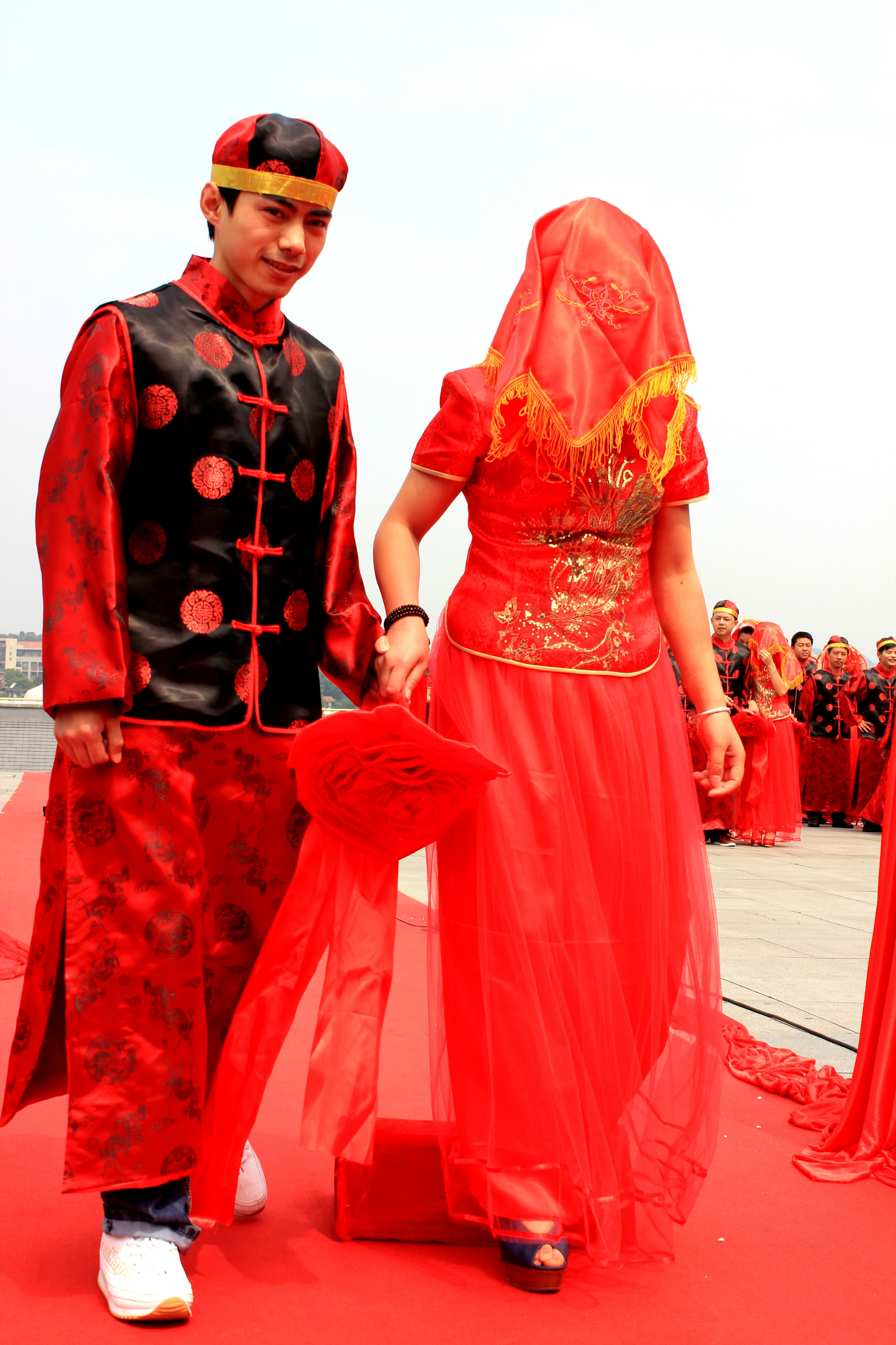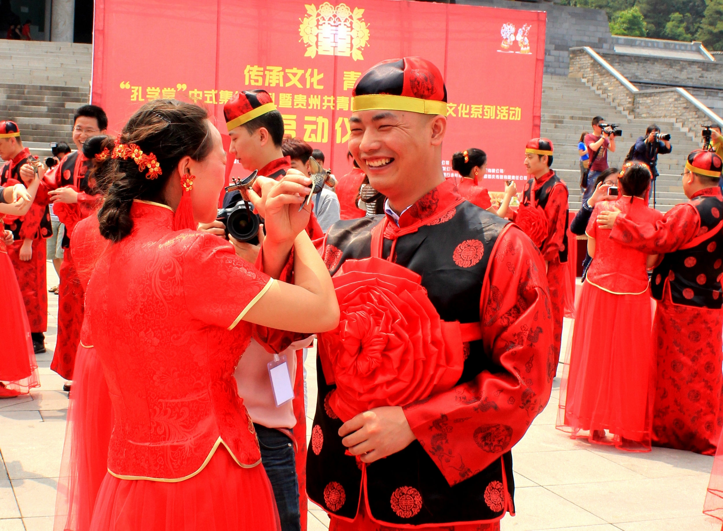 [香港商报讯] 记者 黄庆松 报道:5月20日,由贵州省文明办、团省委举办的孔学堂中式集体婚礼暨“传承文化。青春黔行”主题系列活动在贵阳举行。来自省内的66对新人,齐聚贵阳孔学堂,免费体验汉唐式婚礼。