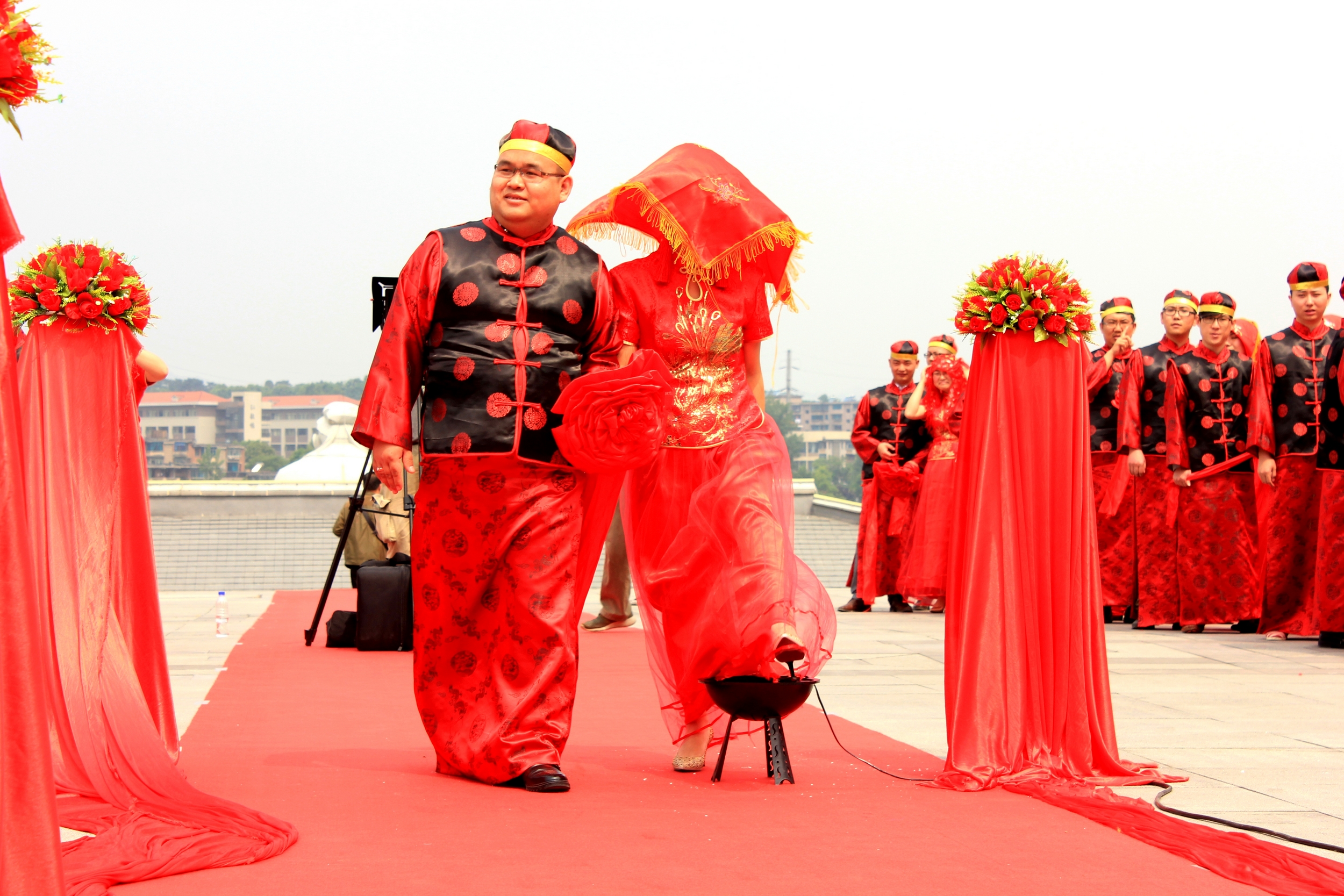 一对新人跨过火盆