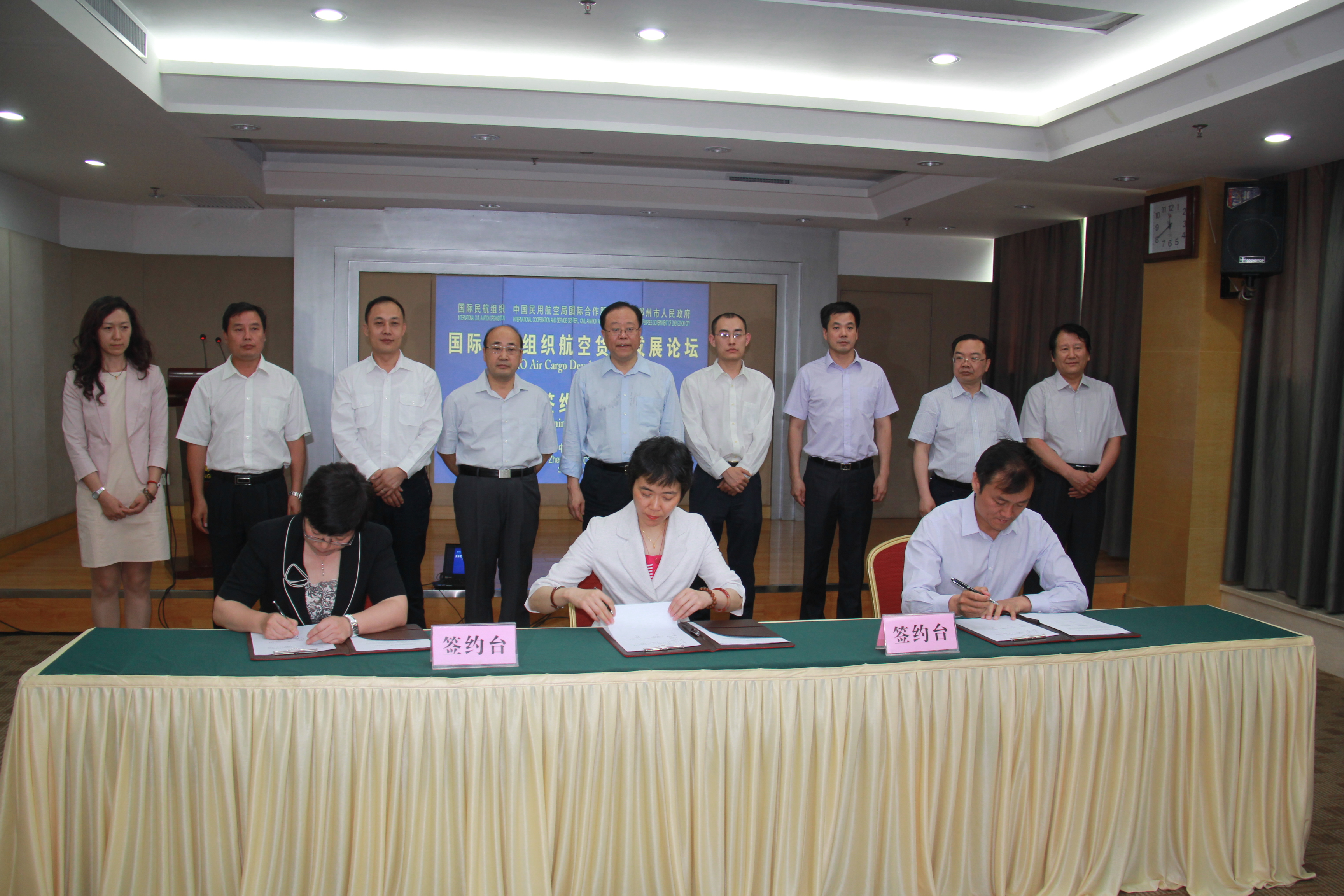 【香港商报讯】记者罗梦亚报道: 2014年5月27日,郑州市人民政府与国际民航组织、中国民用航空局国际合作服务中心关于航空货运发展论坛安排协议的签约仪式在郑州举行。郑州市委副书记、航空港实验区党工委书记胡荃主持签约仪式,郑州市人民政府市长马懿致辞,国际民航组织行政服务局柳芳局长、中国民用航空局国际合作服务中心孟庆芬主任与郑州市人民政府薛云伟副市长代表三方签署了合作协议。