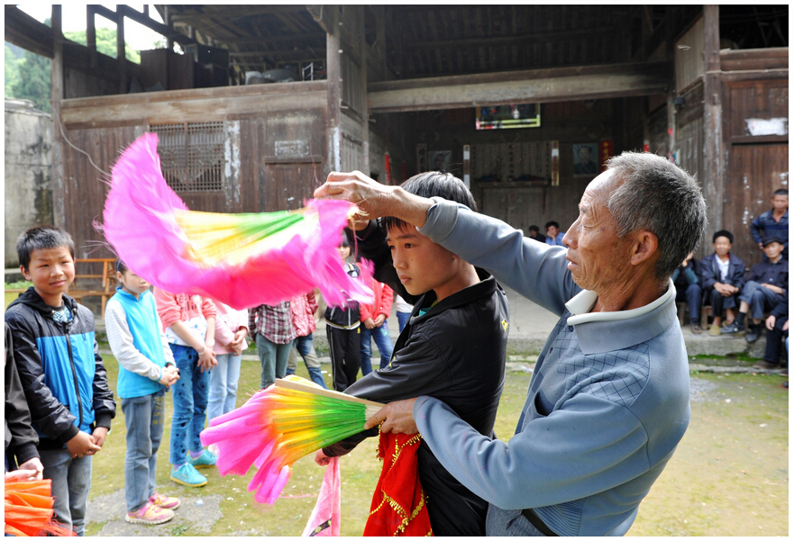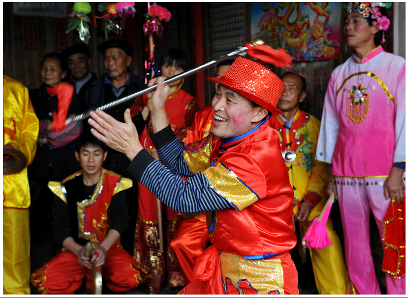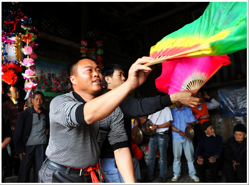 松桃茶灯仪式中的外在表现也具有一定的隐喻意义,包括道具、舞蹈动作、场景转换等。如舞者手中的蒲扇好像就是一个具有神力的万能道具,它根据不同表达内容,具有不同的功能,是跳茶灯必备的、有象征意义的道具:采茶时就是背篓,“双飞燕”时便成了燕子,斩鬼神时就是刀。舞蹈动作中“门斗转”,女高男低,赖花子围着幺妹子转圈,寓意祖先崇拜;太公摇浆则是述说民间传说故事,其隐喻更丰富;赖花子通过三脚猫、矮桩步等“丑态”反衬出女性的美,暗示对女性的讨好等。松桃茶灯仪式的隐喻,无处不在,处处都隐喻着人们心灵深处的那些情感。