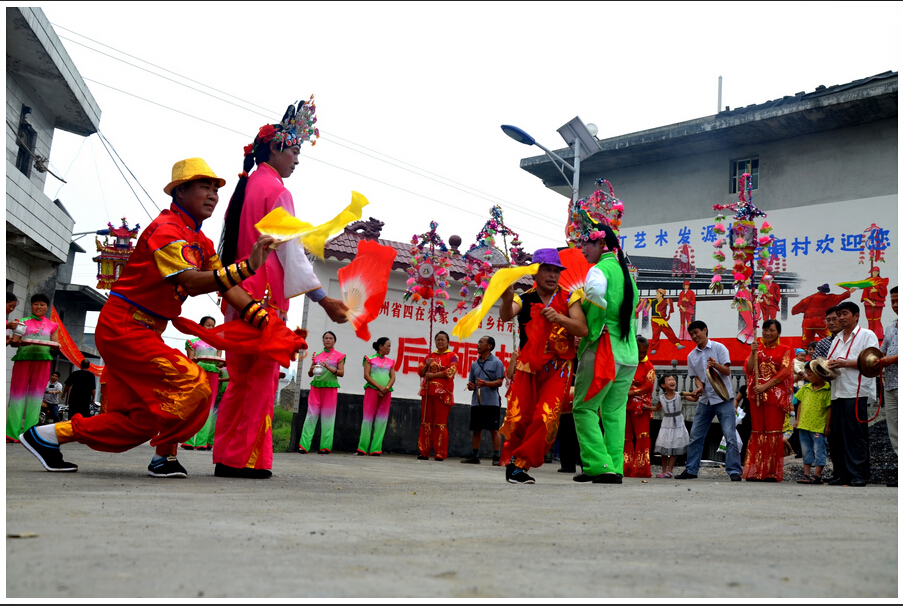 “崴步”都有手部动作配合,表现为手中的道具和扇子的“手中花”和“扇花”的种种变化。如“手中花”有平绕花、下挽花、挑绕花、后翻花、双绕花、侧甩巾、小甩巾、背巾等。“扇花”则更多了,有70多种变化,有的名称也特别富有诗情画意,如怀中抱月、蜻蜓点水、金丝滚绣球、雪花盖顶、凤点头等。这些安排在茶灯戏中更增添了茶灯戏的歌舞色彩的情调、韵味。