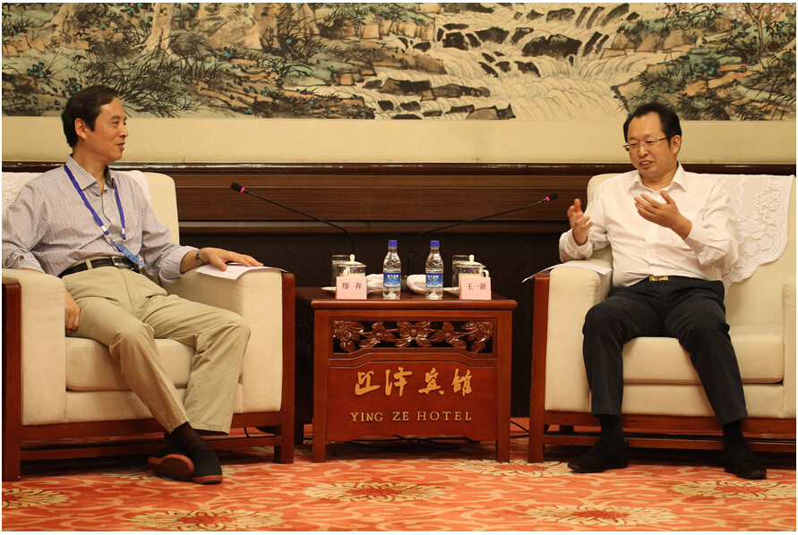 山西省副省长王一新向中国著名作家采风团团长、中国作协副主席廖奔介绍山西历史文化。