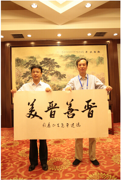中国作协副主席廖奔现场题写“晋善晋美”四个大字,左为山西省旅游局局长冯建平