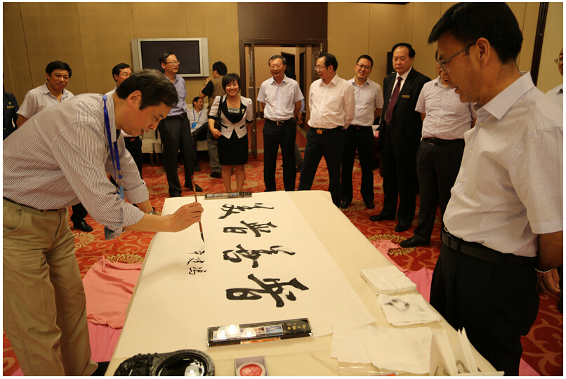 中国作协副主席廖奔现场挥毫泼墨,右一为山西省旅游局局长冯建平。
