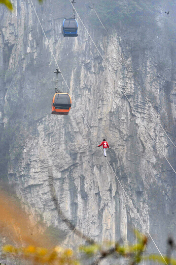 天门山高山索道长达7.5公里,是世界最长、最为壮观的索道之一。尤其是索道后半段在天门山奇峰峻岭之上一线孤悬,凌空飞渡于万仞绝壁之巅,其高绝陡险令人无比震撼。本次挑战活动为无保护行走天门山索道自9B号支架起至10B号止的索道钢绳,行走长度约690米,钢绳全程斜度均达42度,起点及终点两支架海拔高差500余米,为天门山索道最为陡险、支架间距最大的一段。