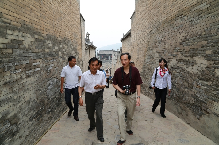 中国作协副主席廖奔与作家刘兆林等走在王家大院的小巷中