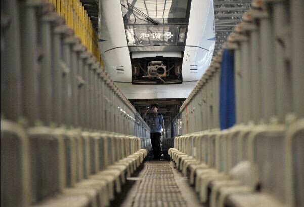 6月19日,工作人员在成都动车运用所检修库对即将开行的动车组进行检修。