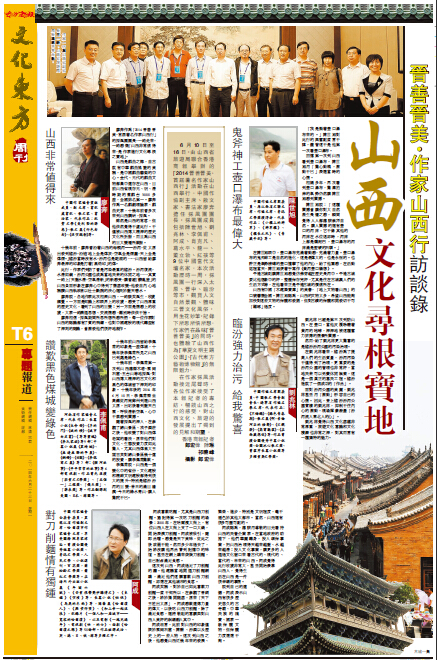 6月10日至16日,由山西省旅游局聯合香港商報舉辦的「2014晉善晉美首屆著名作家山西行」活動在山西舉行。中國作協副主席、散文家、書法家廖奔擔任采風團團長,采風團成員包括陳世旭、劉兆林、李佩甫、阿成、肖克凡、葛水平、龍一、董立勃、紅孩等9位中國當代文壇名家。本次活動歷時一周,采風團一行深入太原、晉中、臨汾等市,觀賞人文自然景觀、體味三晉文化風俗,用生花妙筆,記錄下所思所悟所想。作家們在品味「晉善晉美」的同時,也體驗了山西作為「華夏文明主題公園」、「古代東方藝術博物館」的無限魅力。在作家采風活動接近尾聲時,各位作家接受了本報記者的專訪,暢談山西之行的感受,對山西文化、旅游的發展提出了獨到的見解和期望。