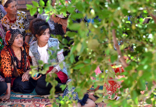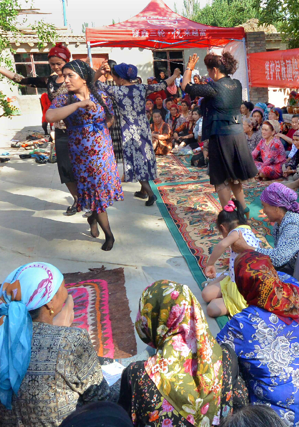 6月23日,上塔依尔于孜村的几位维吾尔族妇女在观看文艺演出。