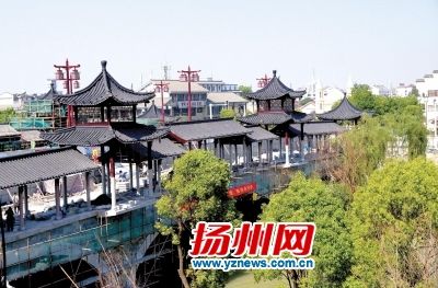 古运河上再添一座古色古香的桥梁。备受市民关注的跃进桥在快车道通车后,景观长廊亭打造接近尾声。5月23日,桥两侧廊亭施工脚手架、网罩基本拆除,十分古典、与扬州古城风貌融合的景观廊桥展露芳容。据悉,整个工程将在本月底全部完成。 (沈扬生)