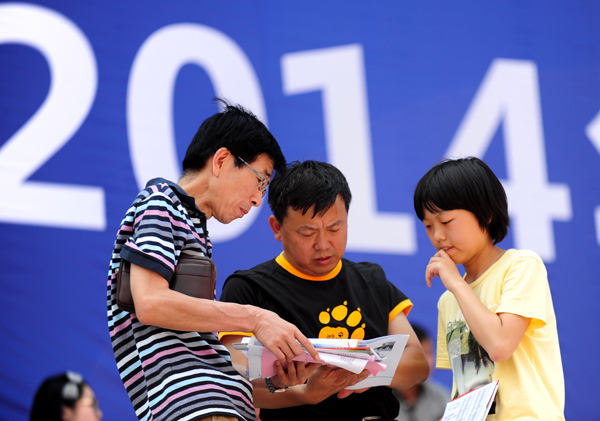 6月25日,家长带着孩子参加沈阳高招谘询大会。