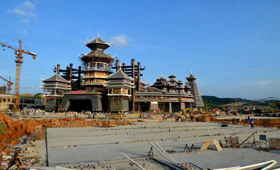 据多彩贵州城营销中心副总经理邹志宏介绍,贵州文化旅游展示中心坐落于龙洞堡多彩贵州城主入口处,毗邻鱼梁河,占地8000平方米,建筑面积19214平方米。目前,展示中心外装已完成95%,内装将于8月10日前完成。该展示中心是省迄今最大的文化旅游展示场所。该项目由多彩广场和主建筑组成,其中,多彩广场主要用于举行各种大型民族演艺、大型赛事活动;主建筑外观综合采用了贵州侗家鼓楼、风雨桥和铜鼓三大重要元素进行设计,建成后将成为世界上最大的单体鼓楼群,并承载贵州文化旅游资源展览、馆藏功能。