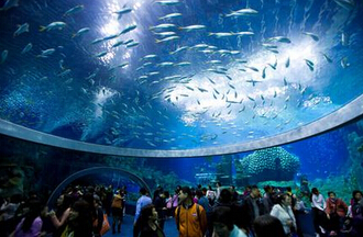 走进鲸鲨馆,犹如置身神奇的海底世界,游客在弧形水下长廊内,可看到成千上万的珍稀鱼类在身边游弋,五光十色的圆形穹顶折射出美丽的光线,带来非常独特的游览体验。鲸鲨馆饲养有不同品种的珍奇鱼类多达15000条,最为震撼的是馆内安装的世界最大亚克力玻璃,长39.6米,高8.3米,厚0.65米,通过领先全球的先进技术无缝连接,视界壮阔,从不同的角度为游客近距离展现无敌海底奇观,还可以和直径达4米的魔鬼鱼亲密接触。