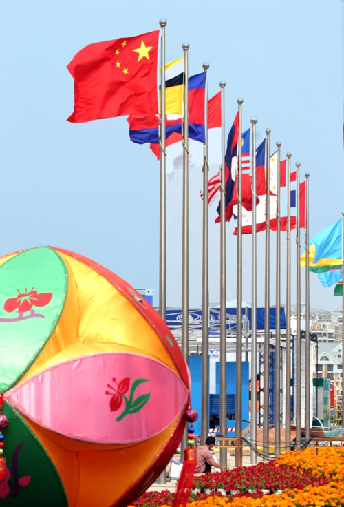东盟国11国的国旗在南宁国际会展中心迎风飘扬