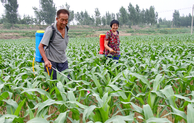 7月10日,河北省新河县西杨村农民杨建坤夫妇在给夏播玉米苗喷洒农药。