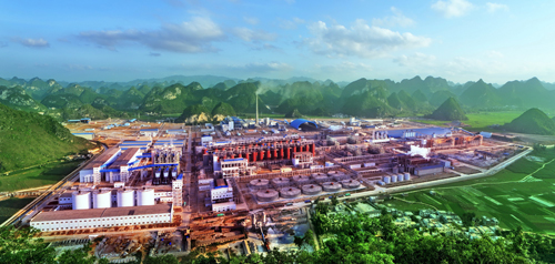从右江河谷到南部三县的“千亿铝产业”集群形成,石化、煤电、锰铜、机械、竹木板浆纸等支柱产业已经具备相当的产能,以铝为主的新工业基地——百色迅速崛起。图为广西华银氧化铝厂区全貌。