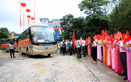 2013年7月18日,中国百色至越南高平国际道路客货运输暨中国百色靖西至越南高平边境旅游线路开通。图为百色客车通过龙邦口岸驶入越南高平省境内,受到当地群众的欢迎。覃蔚峰 摄