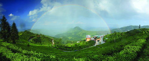 旅游成为新兴产业。成功创建“中国优秀旅游城市”,目前拥有6个国家4A级景区、3个国家级农业旅游示范点和10个自治区级农业旅游示范点,建成百色起义纪念公园、乐业天坑世界地质公园、靖西山水风光等国内外闻名的经典景区名片。图为乐业县龙云茶山