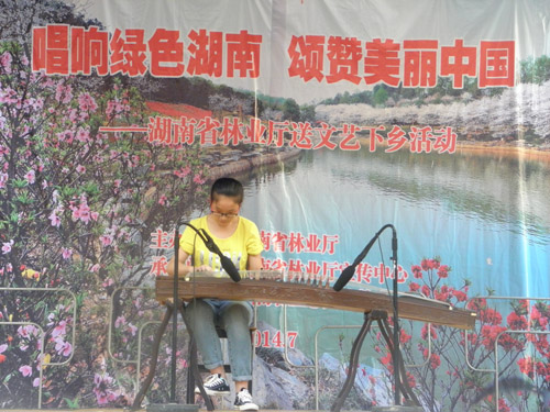 下午艺术团在给宜章城关林业站职工演出时,现场气氛热烈,在歌曲演唱和相声节目中与观众进行了良好的互动。在演出过程中,宜章森林公安子弟,来自宜章第九中学的女学生李暄到后台找到主持人李可可,要求上台弹奏一曲古筝《幸福渠水到俺村》,当李暄小朋友的古筝表演结束后,现场响起了热烈的掌声。