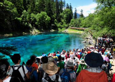 近日,记者在九寨沟景区五彩池等景点看到,头戴太阳帽,手拿遮阳伞的游客人潮涌动在各观景站点上,或忙着拍照留念,或尽情观水赏景,其中学生模样的游客和整家人出动的情况占到很大的比例。据九寨沟景区营销处介绍,近期该景区每天游客接待量稳步保持在20000人左右。特别是从7月1日后,由于全国各地中小学校学生放暑假以后,九寨沟景区旅游接待量较之前有了明显的攀升势头,日接待游客量已超过之前的五一小长假接待量。