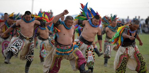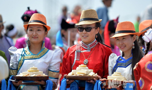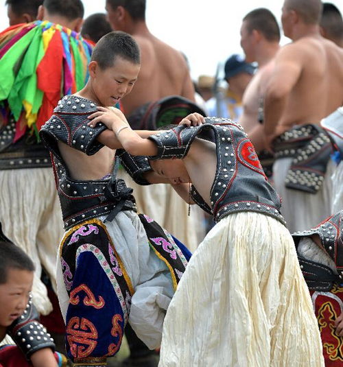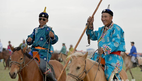 当日,“守望相助”——吉祥草原·2014锡林浩特牧民那达慕在锡林浩特市巴彦宝拉格苏木举行,来自锡林浩特市4个苏木(乡镇)的22个嘎查(村)牧民欢聚草原,参加搏克、赛马、射箭、蒙古象棋、喝马奶、编绳子等独具蒙古族特色的民俗技艺比赛。新华社记者任军川摄