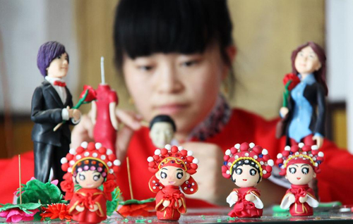运城(山西),2014年7月29日 捏面塑 迎七夕 7月29日,山西省万荣县一面塑馆的工作人员在制作七夕节“情侣面塑”。七夕节前夕,山西省万荣县一面塑馆推出“七夕情人节送她一个别样的面塑礼物”促销活动。这种“七夕面塑”以蒸熟的面粉、甘油为主要原料,经捏、搓、揉、点、切、刻等手法制作而成,色泽鲜艳、栩栩如生。